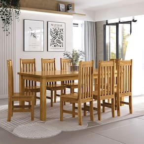8 Cadeiras Medida da Mesa (A x L x P): 78,50 x 220 x 100 Peso da Mesa: 50,3 kg Mesa suporta até: 120 kg Acabamento da Cadeira/Banco: Pintura UV Acabamento da Mesa: Pintura UV Acompanha Manual de Instalação: Sim Ambiente Principal: Sala de Jantar Cadeira/Banco estofada: Não Cadeira/Banco suporta até: 120 kg codigo_ean: 7900288252722 Complexidade da Montagem: Baixa: pode ser montado por uma pessoa sozinha Configuração do Conjunto: Mesa com Cadeiras Cor: Nogueira Cor do Produto: Nogueira Cor Secundária: Marrom De Canto (Canto Alemão): Não Design da Base: 4 Pés Escala de Brilho: Semi-Brilho Espessura do Tampo: 40 mm Estrutura do Assento: Madeira Maciça Formato do Tampo: Retangular Informações Complementares: Possui cantos arredondados e acabamentos com Pintura UV e Verniz Acetinado Atóxico. Encostos das cadeiras no estilo ripado e mesa com pés maciços de 8,5cm x 8,5cm (LxP), aumentando a estabilidade e conforto. Itens Inclusos: 1 Mesa, 8 Cadeiras, Kit Ferragens e Manual de Montagem Linha ou Coleção: Creta Manual de Montagem e Instalação: https://cdn2.madeiramadeira.com.br/atributo/tabulae-moveis/3264086-6341-17598489170595.pdf Marca: Espresso Móveis Material da Base da Mesa: Madeira Maciça Material da Estrutura da Cadeira: Madeira Maciça Material do Tampo: Madeira Maciça Material Principal: Madeira Maciça Medida da Cadeira/Banco (A x L x P): 107 x 40,50 x 42,50 Medida do Tampo (L x C x E): 220 x 100 x 4 Mesa Extensível: Não Necessita Montagem: Sim Origem do Produto: Nacional Peso da Cadeira/Banco: 6,15 kg Possui Apoio para Braços: Não Possui Apoio Para os Pés: Não Possui Vidro: Não Quantidade de Cadeiras: 8 Quantidade de Lugares: 08 Recomendações de Uso, Manutenção e Limpeza: Limpar com flanela ou pano macio seco, não utilizar produtos abrasivos, desengordurantes, álcool ou solvente. Sistema de Montagem: Parafuso, cavilha e cola. Tipo de Madeira Maciça da Base da Mesa: Pinus Tipo de Madeira Maciça do Tampo: Pinus