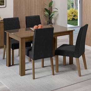 A mesa é retangular, com pés estruturais e acomoda perfeitamente até quatro pessoas. O vidro incolor sobreposto ao tampo de madeira deixa o ambiente ainda mais elegante.