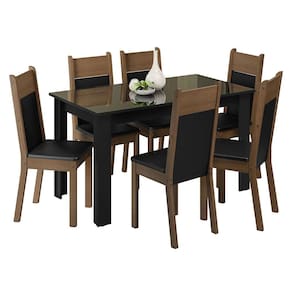 A mesa é retangular, com pés estruturais e acomoda perfeitamente até seis pessoas. O vidro incolor sobreposto ao tampo de madeira deixa o ambiente ainda mais elegante.