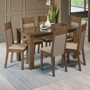 A mesa é retangular, com pés estruturais e acomoda perfeitamente até seis pessoas. O vidro incolor sobreposto ao tampo de madeira deixa o ambiente ainda mais elegante.