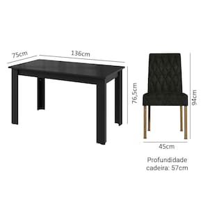 A mesa em tom preto com tampo de vidro sobreposto confere elegância e personalidade ao ambiente. As cadeiras estofadas com tecido Oxford possui um detalhe na costura que garante não só um visual diferenciado mas também mais conforto.