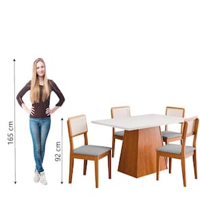 MEDIDAS MESA:: [ A ] = 80 cm [ L ] = 136 cm [ P ] = 90 cm | MEDIDAS CADEIRAS (cada):: [ A ] = 92 cm [ L ] = 46 cm [ P ] = 40 cm | PESO MESA:: 20,70 Kg | PESO CADEIRA:: 6,60 Kg (cada) | PESO SUPORTADO MESA:: 25 Kg (distribuídos) | PESO SUPORTADO CADEIRA:: 110 Kg cada | MODELO:: Conjunto Sala de Jantar Mesa 1,36m Trento 4 Cadeiras Santiago | ACABAMENTO MESA:: Verniz vítreo | MARCA:: Dobuê | ESTRUTURA:: MDP/MDF | MATERIAL DO TAMPO:: MDF | PÉS DA CADEIRA:: Sapatas Plásticas | DIFERENCIAL:: Material de alta resistência, cadeiras com assento acolchoado, encosto com tela. | INSTRUÇÕES E CUIDADOS:: Limpar com pano levemente umedecido com água, não utilizar produtos abrasivos | GARANTIA:: 3 meses pelo fabricante | ACABAMENTO CADEIRA:: Veluplus | TECIDO DA CADEIRA:: Linho | REVESTIMENTO ASSENTO E ENCOSTO DA CADEIRA:: Espuma D20 | SISTEMA DE MONTAGEM:: Parafusos e porcas cilíndricas | ITENS INCLUSOS:: 1 Mesa e 4 cadeiras, 1 manual de montagem e 1 kit parafusos | AVISO:: A Esplanada Móveis se responsabiliza pela entrega dos produtos adquiridos até a porta de entrada ou portaria do endereço indicado, se a portaria do condomínio permitir, as entregas são efetuadas no piso térreo e é de responsabilidade do cliente. | Altura: 80 | Ambiente recomendado: sala de jantar | Forma: retangular | Inclui manual de montagem: sim | Material da tampa: mdp | Quantidade de caixas de embalagem: 6 | Requer montagem: sim | Quantidade de Lugares: 4 | Cor: Madeirado / Cinza