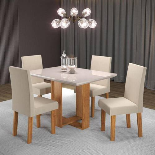 Características: Conjunto com estrutura em MDF/MDP Tampo com espessura 40mm e vidro 4mm Suporta até 50 kg distribuídos Acabamento sem-brilho Pintura UV 4 cadeiras Assento em MDP e espuma D20 Encosto espuma D12 Cada cadeira suporta até 90 kg Revestimento com tecido veludo