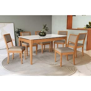 Sala de Jantar Completa Mira Premium Madeira Maciça c/ Tampo Madeirado c/ Vidro 160x90cm e 6 Cadeiras Alice Carvalho/Off White - Boucle Bege Fendi - Kappesberg