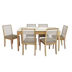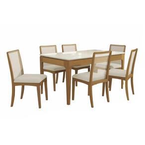 Sala de Jantar Completa Mira Premium Madeira Maciça c/ Tampo Madeirado c/ Vidro 160x90cm e 6 Cadeiras Lara Carvalho/Off White - Boucle Bege Fendi - Kappesberg