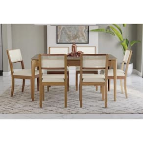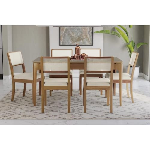 Abaixo segue os produtos do KIT: Sala de Jantar Completa Mira Premium Madeira Maciça c/ Tampo Madeirado c/ Vidro 160x90cm e 6 Cadeiras Lola Carvalho/Freijo Bronze - Linho Bege Argila - Kappesberg