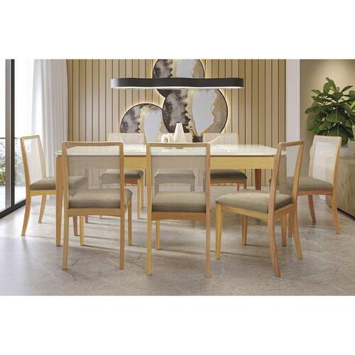 Sala de Jantar Completa Mira Premium Madeira Maciça c/ Tampo Madeirado c/ Vidro 200x100cm e 8 Cadeiras Lara Carvalho/Off White - Boucle Bege Fendi - Kappesberg