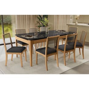 Sala de Jantar Completa Mira Premium Madeira Maciça c/ Tampo Madeirado c/ Vidro 200x100cm e 8 Cadeiras Lara Carvalho/Preto - Boucle Grafite - Kappesberg