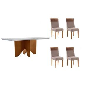 Conjunto Sala de Jantar Nevada c/ Tampo Madeirado c/ Vidro Canto Curvo 120x80cm e 4 Cadeiras Jaspe Madeira Maciça Naturale/Off White - Capuccino/Linho - Blush