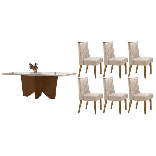 Sala de Jantar Completa Nevada c/ Tampo Madeirado c/ Vidro Canto Curvo 180x90cm e 6 Cadeiras Dafne Madeira Maciça Naturale/Off White - Capuccino/Suede Creme - Rufato