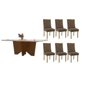 Sala de Jantar Completa Nevada c/ Tampo Madeirado c/ Vidro Canto Curvo 180x90cm e 6 Cadeiras Tilia Madeira Maciça Naturale/Off White - Capuccino/Suede Capuccino - Rufato