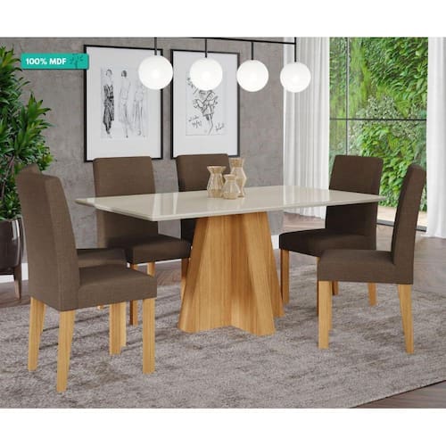 Sala de jantar Patricia de 1,60x,0,80 com 6 cadeiras Maia. Que tal reunir a sua família para um jantar? Nesse momento a Cimol vai está presente, proporcionando situações agradáveis e descontraídas! A mesa Maitê possui uma base em formato cruz, seu tampo é em mdf/vidro com bordas chanfradas e acabamento em laca. Já as cadeiras Maia são uma ótima opção pois a sua estrutura é em mdf com pintura u.v, o assento e encosto possui espumas de alta densidade proporcionando maior conforto. Com um design inovador, a Cimol busca sempre um estilo moderno para o seu ambiente! **IMAGENS MERAMENTE ILUSTRATIVA**