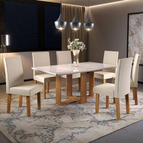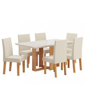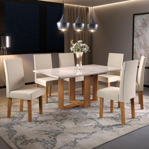 Conjunto com estrutura em MDF/MDP Tampo com espessura 25mm Suporta até 50 kg distribuídos Acabamento sem-brilho Pintura UV 6 cadeiras Assento em MDP e espuma D20 Encosto espuma D12 Cada cadeira suporta até 90 kg Revestimento com tecido veludo