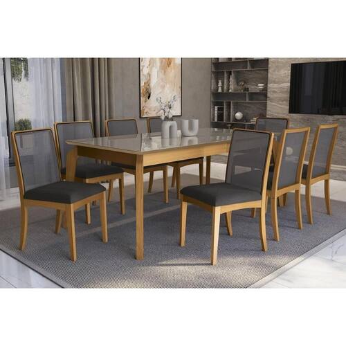 Conjunto Sala de Jantar Petra Premium Madeira Maciça c/ Tampo Madeirado c/ Vidro 200x100cm e 8 Cadeiras Lara Carvalho/Freijo Bronze - Boucle Grafite-K - Blush