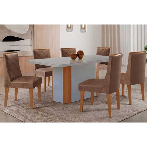 Conjunto Sala de Jantar Pietá c/ Tampo Madeirado c/ Vidro Canto Curvo 180x90cm e 6 Cadeiras Pietá Madeira Maciça Naturale/Off White - Capuccino/Corano - Blush