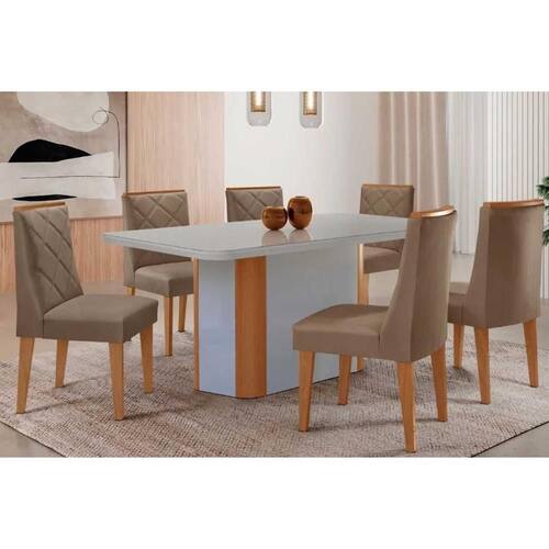 Conjunto Sala de Jantar Pietá c/ Tampo Madeirado c/ Vidro Canto Curvo 180x90cm e 6 Cadeiras Pietá Madeira Maciça Naturale/Off White - Capuccino/Suede - Conjunto Sala de Jantar Rufato Pietá com 6 Cadeiras