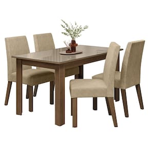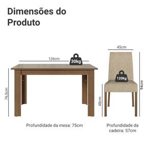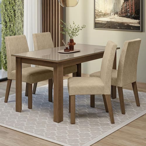 A mesa possui estrutura no tom amadeirado rustic, que traz aconchego e destaca o visual do conjunto. O tampo no tom crema recebe vidro incolor sobreposto, um detalhe que acrescenta sofisticação ao design e ainda facilita a limpeza no dia a dia, mantendo a mesa sempre bonita e prática de usar.