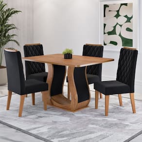 - Material da Estrutura: Mdp e Mdf - Espessura da Estrutura: 25 mm e 50 mm - Possui Gavetas?: Não - Possui Portas?: Não - Possui Espelho?: Não - Possui Prateleiras?: Não - Possui Puxadores?: Não - Linha ou Coleção: Casa Giulia - Escala de Brilho: Semi-Brilho - Possui Tampo?: Sim - Material do Tampo: MDF - Espessura do Tampo (mm): 18 mm - Possui Rodízios?: Não - Possui Sapatas?: Sim - Quantidade de Sapatas: 20 - Possui Pés?: Sim - Quantidade de Pés: 16 - Pés com regulagem de altura?: Não - Possui Borda de PVC nas Bordas?: Não - Grau de Dificuldade de Montagem: Médio - Necessita de Montagem: Sim - Sistema de Montagem: Parafusos, cavilhas, cola e minifix. - Pode Ser Montado Invertido?: Não - Como os Móveis Chegarão em Minha Casa?: Desmontado em caixas, acompanhado de todas as peças, ferragens e manuais para montagem. - Acompanha: manual de montagem e kit ferragem - Categoria: Mesa de Jantar 4 Lugares - Indicação de Uso: Sala de Jantar - Garantia (dias): 90 Dias - Observação: Objetos decorativos que aparecem nas imagens, não acompanham o produto. - Recomendação de Manutenção: Utilizar pano levemente umedecido, seguido de pano seco. Não utilizar quaisquer produtos abrasivos. - Revestimento/Acabamento: Pintura UV - Cadeira Estofada: Sim - Material do Assento: Mdp - Acompanha Cadeiras: Sim - Densidade do Assento: D-26 - Formato da Mesa: Retangular - Quantidade de Lugares: 4 Lugares - Material do Encosto: Mdp - Densidade do Encosto: D-12 - Tecido da Cadeira: veludo - Peso Suportado no Tampo: 50 kg - Altura do Chão até o Assento (cm): 49 - Possui Vidro: Não - Medidas da Cadeira ( A x L x P ): A:101 x L:42 x P:58,5cm - Vidro Temperado: Não - Peso Suportado: 90 kg - Quantidade de cadeiras por conjunto: 4