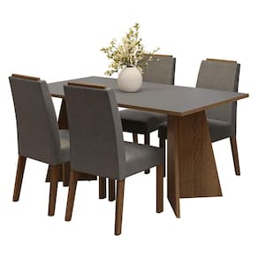 A mesa, com acabamento em tom amadeirado Rustic e o tampo cinza transmitem uma sensação de modernidade, enquanto as cadeiras revestidas em tecido Suede Silver completam o conjunto. A combinação dos acabamentos cria um ambiente acolhedor e elegante, ideal para quem procura beleza e funcionalidade em um só espaço.