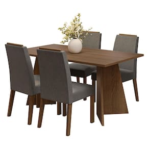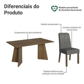 A mesa com acabamento em tom amadeirado Rustic transmite uma sensação acolhedora, enquanto o tecido das cadeiras em Suede Silver oferece conforto e um toque moderno, criando um conjunto perfeito para quem busca estilo e funcionalidade no dia a dia.