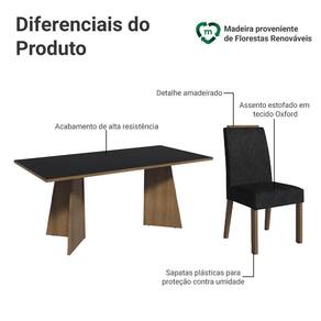 A estrutura da mesa é no acabamento amadeirado Rustic, o tampo em preto e as cadeiras revestidas em tecido Suede Oxford. A combinação de tons escuros e detalhes amadeirados cria um ambiente moderno, tornando o conjunto ideal para unir beleza, conforto e praticidade em sua sala de jantar.