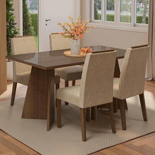 A mesa, com acabamento em tom amadeirado Rustic e tampo com vidro sobreposto, traz sofisticação e resistência, criando um visual moderno e elegante para o ambiente. As cadeiras, revestidas em tecido Suede Imperial, completam o conjunto com conforto e um toque de leveza.
