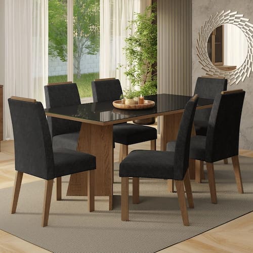 Com seis cadeiras estofadas em tecido Suede Oxford, cada detalhe, incluindo o acabamento amadeirado no topo, oferece elegância. A mesa, com base em formato trapézio, tampo na tonalidade preta e vidro incolor sobreposto, proporciona estabilidade e amplo espaço para acomodar toda a família, tornando cada refeição ainda mais agradável.