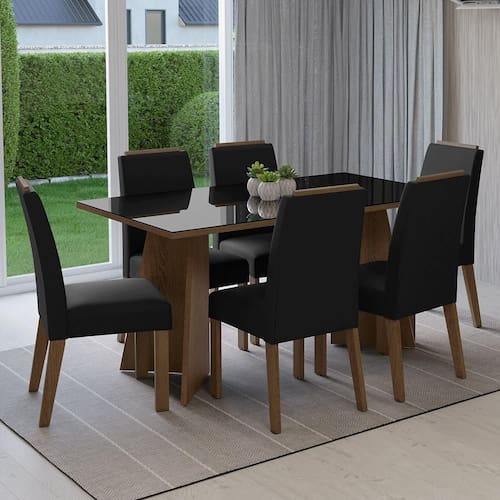 Com seis cadeiras estofadas e tampo com vidro incolor sobreposto, o conjunto oferece espaço, conforto e sofisticação que sua família precisa. O diferencial está no detalhe amadeirado no topo das cadeiras, que valoriza ainda mais o design e proporciona maior durabilidade ao móvel.