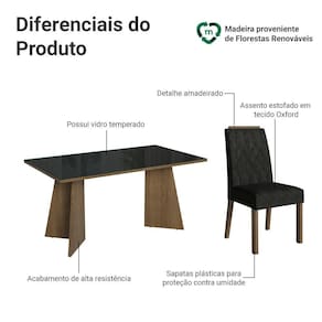 O acabamento da mesa em tom amadeirado Rustic e o tampo em preto, combinados com as cadeiras revestidas em tecido Oxford completam o conjunto, trazendo um toque contemporâneo que combina perfeitamente com diferentes estilos de decoração.