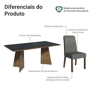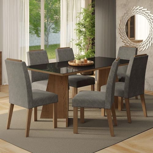 Com seis cadeiras estofadas em tecido Suede Silver, cada detalhe, incluindo o acabamento amadeirado no topo, oferece elegância. A mesa, com base em formato trapézio, tampo na tonalidade preta e vidro incolor sobreposto, proporciona estabilidade e amplo espaço para acomodar toda a família, tornando cada refeição ainda mais agradável.