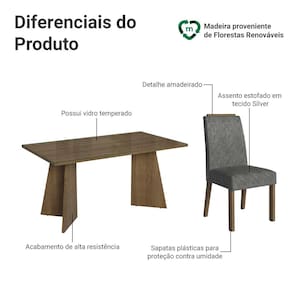 A estrutura da mesa é no acabamento amadeirado Rustic, combinado com as cadeiras estofadas com o tecido Suede Silver, criam um visual moderno. Ideal para quem busca unir beleza, funcionalidade e durabilidade em um único móvel.