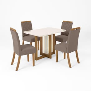 Se você está procurando um conjunto de sala de jantar elegante e confortável, o conjunto Marie é a escolha perfeita para você. Composto por uma mesa em MDF e vidro de alta qualidade e quatro cadeiras estofadas, este conjunto oferece o equilíbrio perfeito entre design contemporâneo e conforto. Combina funcionalidade e beleza, e será destaque em sua casa por muitos anos. Medida da Mesa (A x L x P): 80 x 120 x 80 Cm Peso da Mesa: 28 Mesa suporta até: 40 Acabamento da Cadeira/Banco: Pintura Texturizada Acabamento da Mesa: Pintura Texturizada Almofada do assento: Fixa Altura do Conjunto: 80 Ambiente Principal: Sala de Jantar Cadeira/Banco estofada: Encosto e Assento Estofados Cadeira/Banco suporta até: 120 Complexidade da Montagem: Alta: deve ser montado por um montador especializado Cor: Marrom/Off White/Marrom Amêndoa Cor do Produto: Marrom/Off White/Marrom Amêndoa Cor Secundária: Bege De Canto (Canto Alemão): Não Enchimento do Assento: Espuma D-18 Enchimento do Encosto: Espuma D-18 Escala de Brilho: Fosco Espessura do Tampo: 29 Espessura do Vidro: mm Estrutura do Assento: MDP/MDF Estrutura do Encosto: MDF/MDP Formato do Tampo: Retangular Informações Complementares: • Tampo com Acabamento em usinagem negativa; • Borda Arredondada com Pintura Laqueada que garante mais Resistência e durabilidade; • Vidro com pintura em Off White e canto arredondado acompanhando o acabamento do Tampo; Itens Inclusos: 1 Mesa, 4 Cadeiras, Kit Ferragens, Manual de Monagem Linha ou Coleção: Marie Manual de Montagem e Instalação: https://cdn2.madeiramadeira.com.br/atributo/henn-sala-de-jantar/1335839-se560-conj-sala-jantar-marie-4ca-ct-arre-c-vid.pdf Material da Base da Mesa: MDP Material da Estrutura da Cadeira: MDF/MDP Material do Tampo: Vidro/MDF Medida da Cadeira/Banco (A x L x P): 105 x 43 x 56 Cm Medida do Tampo (L x C x E): 80 x 120 x 2,9 Cm Mesa Extensível: Não Necessita Montagem: Sim Origem do Produto: Nacional Peso da Cadeira/Banco: 8 Possui Apoio para Braços: Não Possui Apoio Para os Pés: Não Possui Suporte Giratório: Não Quantidade de Lugares: 04 Recomendações de Uso, Manutenção e Limpeza: Para limpeza de seu móvel, use uma flanela seca ou umedecida. Não utilize produtos químicos que possam danificar o produto. Revestimento da Cadeira/Banco: Suede Sistema de Montagem: Parafusos e Cavilhas Vidro Temperado: Não