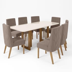 Se você está em busca de um conjunto de mesa elegante e confortável para receber seus convidados em grande estilo, o conjunto Michelle é a escolha perfeita. Composto por uma mesa com tampo em MDF e vidro e oito cadeiras estofadas, ele traz sofisticação e conforto para a sua sala de jantar. Seja para uma refeição especial em família ou para uma grande comemoração, o conjunto Michelle garante o charme e o conforto que você merece. Descubra agora mesmo esta opção de alta qualidade e design refinado. Medida da Mesa (A x L x P): 80 x 200 x 90 Cm Peso da Mesa: 65 Mesa suporta até: 40 Acabamento da Cadeira/Banco: Pintura Texturizada Acabamento da Mesa: Pintura Texturizada Almofada do assento: Fixa Altura do Conjunto: 80 Ambiente Principal: Sala de Jantar Cadeira/Banco estofada: Encosto e Assento Estofados Cadeira/Banco suporta até: 120 Complexidade da Montagem: Alta: deve ser montado por um montador especializado Cor: Marrom/Off White/Marrom Amêndoa Cor do Produto: Marrom/Off White/Marrom Amêndoa Cor Secundária: Bege De Canto (Canto Alemão): Não Enchimento do Assento: Espuma D-23 Enchimento do Encosto: Espuma D-15 Escala de Brilho: Fosco Espessura do Tampo: 2.9 Espessura do Vidro: mm Estrutura do Assento: MDP/MDF Estrutura do Encosto: MDF/MDP Formato do Tampo: Retangular Informações Complementares: • Tampo com Acabamento em usinagem negativa; • Borda Arredondada com Pintura Laqueada que garante mais Resistência e durabilidade; • Vidro com pintura em Off White e canto arredondado acompanhando o acabamento do Tampo; Itens Inclusos: 1 Mesa, 8 Cadeiras, Kit Ferragens, Manual de Monagem Linha ou Coleção: Michelle Manual de Montagem e Instalação: https://cdn2.madeiramadeira.com.br/atributo/henn-sala-de-jantar/1336273-se563-conj-sala-jantar-michelle-8ca-ct-arre-c-vid.pdf Material da Base da Mesa: MDF/MDP Material da Estrutura da Cadeira: MDF/MDP Material do Tampo: Vidro/MDF Medida da Cadeira/Banco (A x L x P): 80 x 90 x 200 Medida do Tampo (L x C x E): 90 x 200 x 2,9 Cm Mesa Extensível: Não Necessita Montagem: Sim Origem do Produto: Nacional Peso da Cadeira/Banco: 9 Possui Apoio para Braços: Não Possui Apoio Para os Pés: Não Possui Suporte Giratório: Não Quantidade de Lugares: 08 Recomendações de Uso, Manutenção e Limpeza: Para limpeza de seu móvel, use uma flanela seca ou umedecida. Não utilize produtos químicos que possam danificar o produto. Revestimento da Cadeira/Banco: Suede Sistema de Montagem: Parafusos e Cavilhas Vidro Temperado: Não