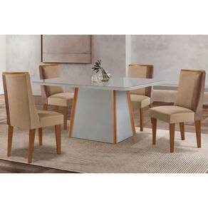 Conjunto Sala de Jantar Tilia c/ Tampo Madeirado c/ Vidro Canto Curvo 120x80cm e 4 Cadeiras Tilia Madeira Maciça Naturale/Off White - Capuccino/Linho - Blush