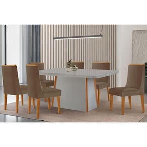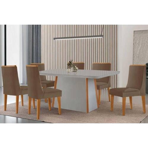 Sala de Jantar Completa Tilia c/ Tampo Madeirado c/ Vidro Canto Curvo 180x90cm e 6 Cadeiras Dakota Madeira Maciça Naturale/Off White - Capuccino/Suede Capuccino - Rufato Abaixo segue os produtos do KIT: Sala de Jantar Completa Tilia c/ Tampo Madeirado c/ Vidro Canto Curvo 180x90cm e 6 Cadeiras Dakota Madeira Maciça Naturale/Off White - Capuccino/Suede Capuccino - Rufato