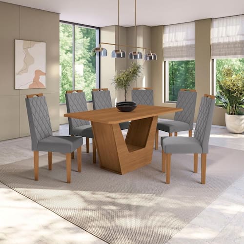 Tanto o encosto quanto o assento são estofados e recobertos com tecido veludo titânio, garantindo um toque suave e conforto em todos os momentos. Os diferenciais ficam por conta das costuras na parte interna do encosto, que proporcionam estilo e elegância, e o puxador em madeira com pegador, além de beleza, facilita o manuseio, evitando sujar ou danificar o tecido, garantindo uma composição estilosa e sofisticada para sua sala de jantar. Renove sua sala de jantar e aproveite cada momento com um Conjunto da Sala de Jantar da Kappesberg.