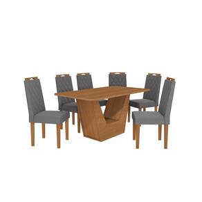 Medindo 74cm de altura, 104cm de largura e 40cm de profundidade, o diferencial fica para a estrutura da base, com formato em "U", fazendo da peça o ponto de destaque da sua sala de jantar, e quando combinada ao tampo retangular, acomoda até seis pessoas. Produzido em MDP de 25mm, garante robustez, firmeza e qualidade, e as pontas chanfradas proporcionam mais segurança e praticidade. Com medidas de 160cm de largura e 90cm de profundidade, sua pintura é touch na cor canela, com a textura dos veios da madeira, garantindo beleza e modernidade, além da sensação de aconchego ao ambiente. Já as cadeiras que compõem o conjunto, são entregues desmontadas, e com estrutura resistente, em madeira de eucalipto, medem 97,5cm de altura, sendo 48cm a altura do assento, 42cm de largura e 58cm de profundidade, suportando até 130kg.