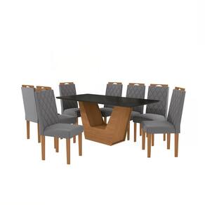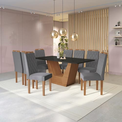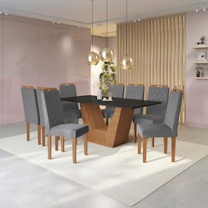 Medindo 74cm de altura, 104cm de largura e 40cm de profundidade, o diferencial fica para a estrutura da base, com formato em "U", fazendo da peça o ponto de destaque da sua sala de jantar, e quando combinada ao tampo retangular em MDF, acomoda até oito pessoas. Pintado na cor preto fosco, o destaque fica para o vidro na mesma cor, garantindo elegância para a composição. Com medidas de 180cm X 90cm e espessura de 30mm, ele suporta até 90kg, e suas bordas arredondadas garantem um design moderno e mais segurança, deixando sua sala de jantar completa e sofisticada. Já as cadeiras que compõem o conjunto, são entregues desmontadas, e com estrutura resistente, em madeira de eucalipto, medem 97,5cm de altura, sendo 48cm a altura do assento, 42cm de largura e 58cm de profundidade, suportando até 130kg.