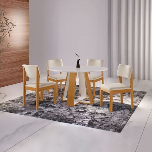 Na hora de receber visitas para refeições em casa você não quer se preocupar com mais nada além do cardápio, certo? Então para ter certeza de que seus convidados se sentirão bem recepcionados invista no Conjunto de Mesa de Jantar Grécia com cadeiras Jade, um kit completo e com tudo o que você precisa para um evento perfeito: 4 cadeiras aconchegantes, tampo amplo e um design de encher os olhos. Além do visual moderno, a combinação de cores forma ainda um móvel daqueles dignos de muitos elogios e que será palco para ótimos momentos. Medida da Mesa (A x L x P): 80cm x 110cm x 110cm Peso da Mesa: 39,2 kg Mesa suporta até: 50.0000 Acabamento da Cadeira/Banco: Pintura UV Acabamento da Mesa: Pintura UV Ambiente Principal: Sala de Jantar Cadeira/Banco estofada: Encosto e Assento Estofados Cadeira/Banco Estofada: Encosto e Assento Estofados Cadeira/Banco suporta até: 120.0000 codigo_ean: 7900288156655 Complexidade da Montagem: Média: pode ser montado por mais de uma pessoa e/ou necessite de maior conhecimento para montagem Cor: Cinamomo/Creme/Off White Cor das Cadeiras: Verde Cor do Produto: Cinamomo/Creme/Off White Cor Secundária: Marrom De Canto (Canto Alemão): Não Enchimento do Assento: Espuma D-20 Enchimento do Encosto: Espuma D-18 Escala de Brilho: Semi-Fosco Espessura do Tampo: 25 mm Formato do Tampo: Redondo Itens Inclusos: 1 Mesa, 4 Cadeiras, Kit Ferragens e Manual de Montagem Linha ou Coleção: Jade Manual de Especificação Técnica: https://product-hub-prd.madeiramadeira.com.br/377597350/documents/5ad966f2-1904-4d86-9d45-001f44e0e15a2945670286817479321518965.pdf Manual de Montagem e Instalação: https://product-hub-prd.madeiramadeira.com.br/377597350/documents/1424731e-eac2-4b8b-9dfc-c80d8df07d8a294566828681747932130983.pdf Marca: LJ Móveis Material da Base da Mesa: MDF/MDP Material da Estrutura da Cadeira: MDF/MDP Material do Tampo: Vidro/MDF Material Principal: Madeira/MDF Medida da Cadeira/Banco (A x L x P): 90cmx48cmx57cm Medida do Tampo (L x C x E): 110cmx110cmx2,5cm Mesa Extensível: Não Necessita Montagem: Sim Origem do Produto: Nacional Peso da Cadeira/Banco: 8,85 kg Possui Apoio para Braços: Não Possui Apoio Para os Pés: Não Quantidade de Cadeiras: 4 Quantidade de Lugares: 04 Recomendações de Uso, Manutenção e Limpeza: Para melhor conservação do seu móvel, não utilizar produtos de limpeza. Utilizar somente levemente úmido. Revestimento da Cadeira/Banco: Suede Sistema de Montagem: 1 Mesa, 4 Cadeiras, Kit Ferragens e Manual de Montagem
