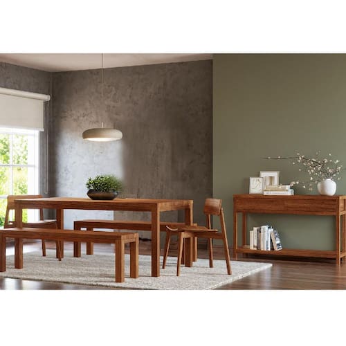 Conjunto Sala Jantar Nature: Aparador, Mesa, Banco e Cadeiras Rústico Escuro Madeira Pinus