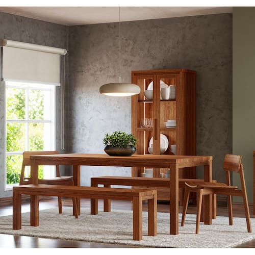 Conjunto Sala Jantar Nature: Cristaleira, Mesa, Banco e Cadeiras Rústico Escuro Madeira Pinus