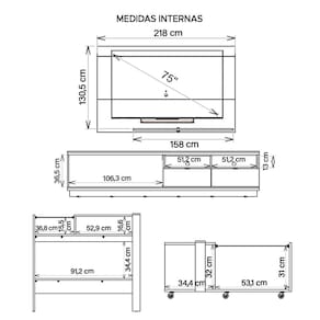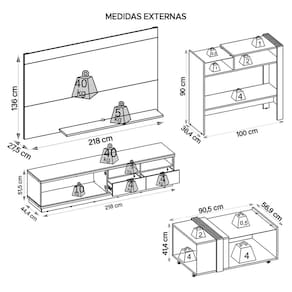O Conjunto Renda è ideal para sua sala de estar, deixando o ambiente mais moderno e elegante. O Kit renda é composto por uma Bancada Rack Renda, Painel, Aparador e uma Mesa. Ambos são feitos em MDP e HDF contém maior resistência e durabilidade ao móvel. Dimensões da Bancada:Altura: 51,5 cmLargura: 218 cmProfundidade: 44,4 cmPeso: 67,6 kgDimensões do Painel:Altura: 136 cmLargura: 218 cmProfundidade: 27,5 cmPeso: 41 kgDimensões do Aparador:Altura: 90 cmLargura: 100 cmProfundidade: 36,4 cmPeso: 17,11kgDimensões Mesa:Altura: 40 cm Largura: 90,5 cm Profundidade: 54 cm Peso: 13,18kgESPECIFICAÇÕES TÉCNICASBancada Rack Renda:Possui 2 NichosPuxadores em AlumínioSuporta TV's até 75 PolegadasPossui 2 Portas com design 3D a laserPossui 2 Gavetas com corrediças telescópicasPainel Malha:Possui 1 Prateleira Ampla de 158 cmSuporta Televisores Até 75 PolegadasPrateleira pode ser montada na parte superior ou inferiorAparador MênfisPossui 1 NichoPossui Design ExclusivoPossui 2 Prateleiras sendo 1 em vidroMesa Nubia:Possui 1 NichoPossui 1 Prateleira De VidroPossui 4 Rodizios Em SiliconePeso Suportado Bancada:Tampo 40kgPortas 5kg (cada)Nichos 2kg (cada)Gavetas 4kg (cada)Peso Suportado Painel:Painel 40kgPrateleira 5kgPeso Suportado Aparador:Nicho 2kgTampo 1kgPrateleira 4kgPrateleira (Vidro) 0,5kgPeso Suportado Mesa:Prateleira: 0,5 kgTampo: 2kgNicho: 4kgBase: 4kgAcompanha manual de montagemContém furação para passagem de fiosTonalidade do Produto: Off White / BuritiEstrutura em MDP de 15mm e 40mm de espessura. HDF de 3mm de espessura.Garantia 90 dias contra defeito de fabricaçãoEste conjunto chegará em sua casa separado em 6 Volumes(1º Volume)Altura: 9 cmLargura: 45 cmComprimento: 223 cm(2º Volume)Altura: 7 cmLargura: 45 cmComprimento: 224 cm(3º Volume)Altura: 8 cmLargura: 164 cmComprimento: 25 cm(4º Volume)Altura: 4 cmLargura: 224 cmComprimento: 69 cm(5º Volume)Altura: 11 cmLargura: 105 cmComprimento: 38 cm(6º Volume)Altura: 7,7 cm Largura: 94,7 cm Comprimento: 54,6 cm Recomendações de limpeza:- Limpar com pano macio, seco ou úmido, sem uso de produtos abrasivos. Pois, podem trazer danos ao produto.Sobre a entrega:- As transportadoras contratadas, não realizam entregas em apartamentos. Realizando assim a entrega na portaria do prédio.*Produto segue desmontado, montagem por conta do comprador.*Imagens do produto são meramente ilustrativas.
