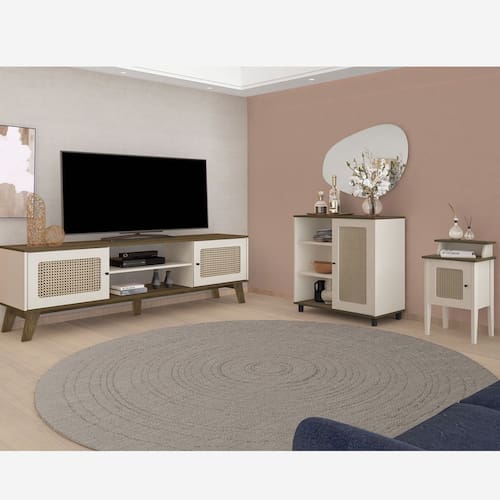 Conjunto Sala Rack p/ TV até 75”, Buffet Aparador 1 Porta, Mesa de Apoio Pinho/Off White Charlotte - Artely