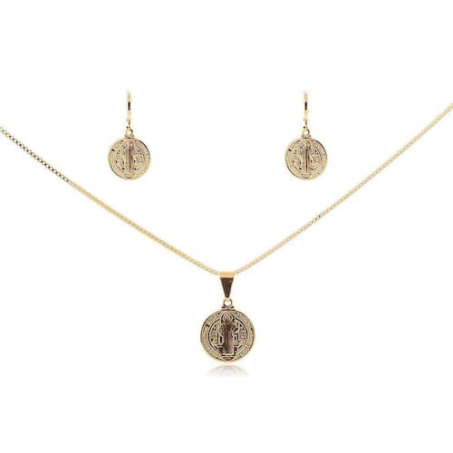 Conjunto São Bento O Conjunto São Bento são acessórios incríveis para quem ama religiosidade e apresentar isso em sua essência. Monte look's e composições incríveis com os acessórios folheados em ouro do Conjunto São Bento. medida da Corrente: 45cm;Extensor: 4cm.Medida do Diâmetro do Brinco - 3cm.Medida do Diâmetro do Pingente - 2,3cm. Ficha técnica - Cor: Dourado