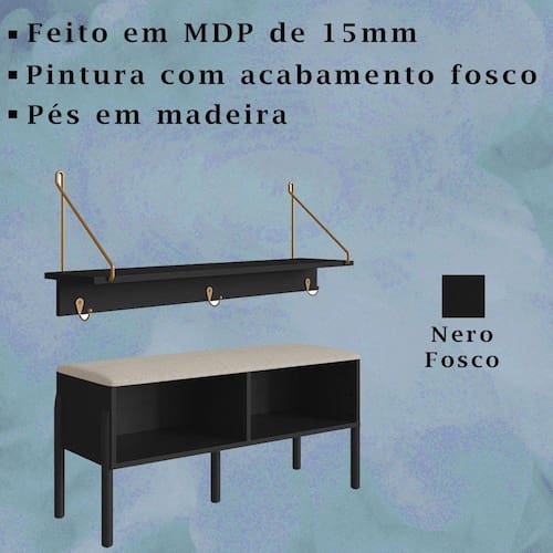 O Conjunto de Sapateira e Prateleira Oslo Móveis que agregam muito ao dia a dia, possuem diversas funções: sapateira possibilita uma melhor organização para armazenar os calçados, banco possibilita sentar-se enquanto calça ou descalça os sapatos, a prateleira tem a função de pendurar ou acomodar diversos objetos. Produzida em MDP com acabamento BP, pés de madeira maciça e assento estofado. Traz como característica um traço artesanal, suave e acolhedor. Com design escandinavo minimalista, remete em suas linhas retas a simplicidade, charme e funcionalidade que sua casa merece. Este produto chegará em sua casa separado em 03 volumes.