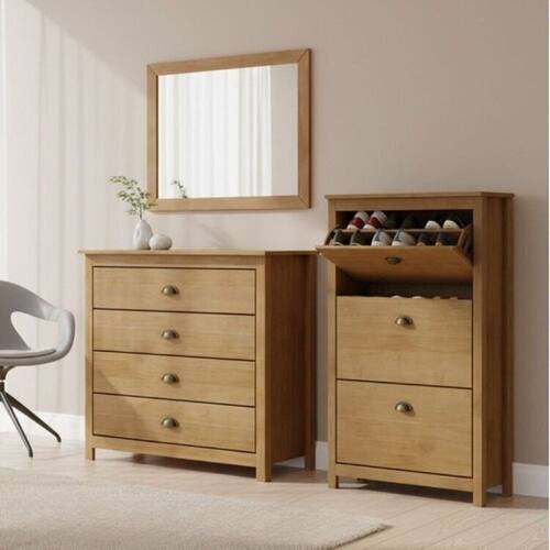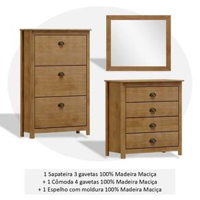Produzido 100% em madeira maciça de pinus com acabamento em verniz PU/UV acetinado na cor Freijó. A sapateira mantém calçados organizados e acessíveis, a cômoda com quatro gavetas com corrediças telescópicas acomoda roupas e objetos pessoais, enquanto a moldura com espelho valoriza o ambiente e agrega funcionalidade. Um conjunto que une beleza, durabilidade, praticidade e conforto, perfeito para quartos bem planejados e elegantes. Possui Portas: Não Possui Rodízio: Não Altura do Conjunto: 123 cm Ambiente: null Ambiente Principal: Quarto Cor: Freijó Informação Complementar: 1x Cômoda 4 Gavetas Topázio 100% Madeira Maciça para Quarto Freijó Largura: 80 cm Altura: 85 cm Peso: 21,3 kg Profundidade: 41 cm Necessita Montagem: Sim