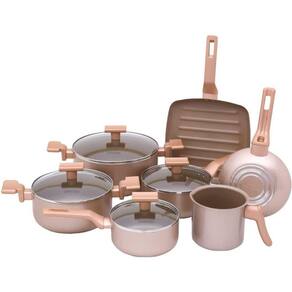 Conjunto Sartin Cook 7 pçs Cerâmico Nossa linha Sartin Cook Champanhe pode ser utilizada em todos os tipos de fogões sendo elétricos, vitrocerâmicos e a gás. Cada item do conjunto possui uma base em alto relevo também revestida em cerâmica que impede o surgimento de marcas em fogões tipo vitrocerâmico. O material conduz o calor de forma uniforme, reduzindo o consumo de gás e energia dessa forma permitindo que você cozinhe os alimentos em fogo baixo ou médio. O conjunto é composto por duas panelas com tampa, duas caçarolas com tampa, uma frigideira , um grill e uma leiteira. Sua tampa é de vidro temperado com saída para vapor, e sua alça é revestida com tecnologia soft-touch confortável de segurar e não queima as mãos. Abaixo, consulte medidas no campo de descrição do produto. Os itens que compõe o conjunto são práticas para que você prepare refeições completas. O material permite que você cozinhe os alimentos em fogo baixo ou médio e ainda mantém as refeições aquecidas por mais tempo, para que você consiga servir e comer longas refeições com as pessoas queridas. Extremamente prático e funcional, com o conjunto formado é possível preparar suas receitas preferidas, podendo ser utilizado para fazer diversos tipos e gramaturas de alimentos. Itens práticos e que ocupam pouco espaço em seu armário, também foram desenvolvidos para não permitir que os alimentos grudem, além de serem livres de metais pesados e elementos prejudiciais a saúde, dessa forma entrando na classificação A ótima no inmetro. Segue medida e capacidade de cada um deles: Panela com Tampa I: D: 16cm x A: 7,5cm x 1,5L / Panela com Tampa II: D: 18cm x A: 8cm x 2L / Caçarola com Tampa I: D: 22cm x 9,5cm x 3,6L / Caçarola com Tampa II: D: 24cm x A: 11cm x 5L / Frigideira: D: 18cm x A: 4cm x 0,75 / Grill: D: 24cm x A: 24cm x 1,2L / Leiteira: D: 12cm x A: 11,5 x 1,3L / Espessura dos Itens: Panelas, Frigideiras e Caçarolas: 2mm; Grill: 2,5mm