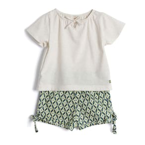 A blusinha tem manguinha curta, lacinho na gola e elástico para ajudar na hora de trocar a princesinha. O shortinho tem elástico na cintura para facilitar a vida das mamães e papais e lacinho nas perninhas.