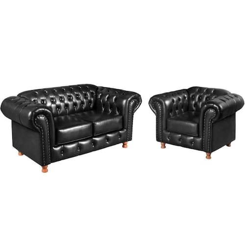 Conjunto Sofá 2 Lugares e Poltrona Chesterfield Luís XV Vintage Retrô Capitonê Couro Preto