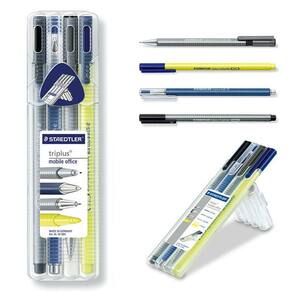 Conjunto Staedtler Triplus Mobile Office 4 Peças Perfeito para o uso na escola ou no escritório. Maior qualidade em seus traços e anotações Ideal para presentear amantes da arte e executivos. Contem na Embalagem: 1 Caneta Triplus Fineliner 0,3mm na cor preta. 1 Lapiseira Triplus Micro 0.5mm 1 Marca texto fluorescente Triplus Textsurfer Amarelo 1 Caneta Triplus Ball M Azul